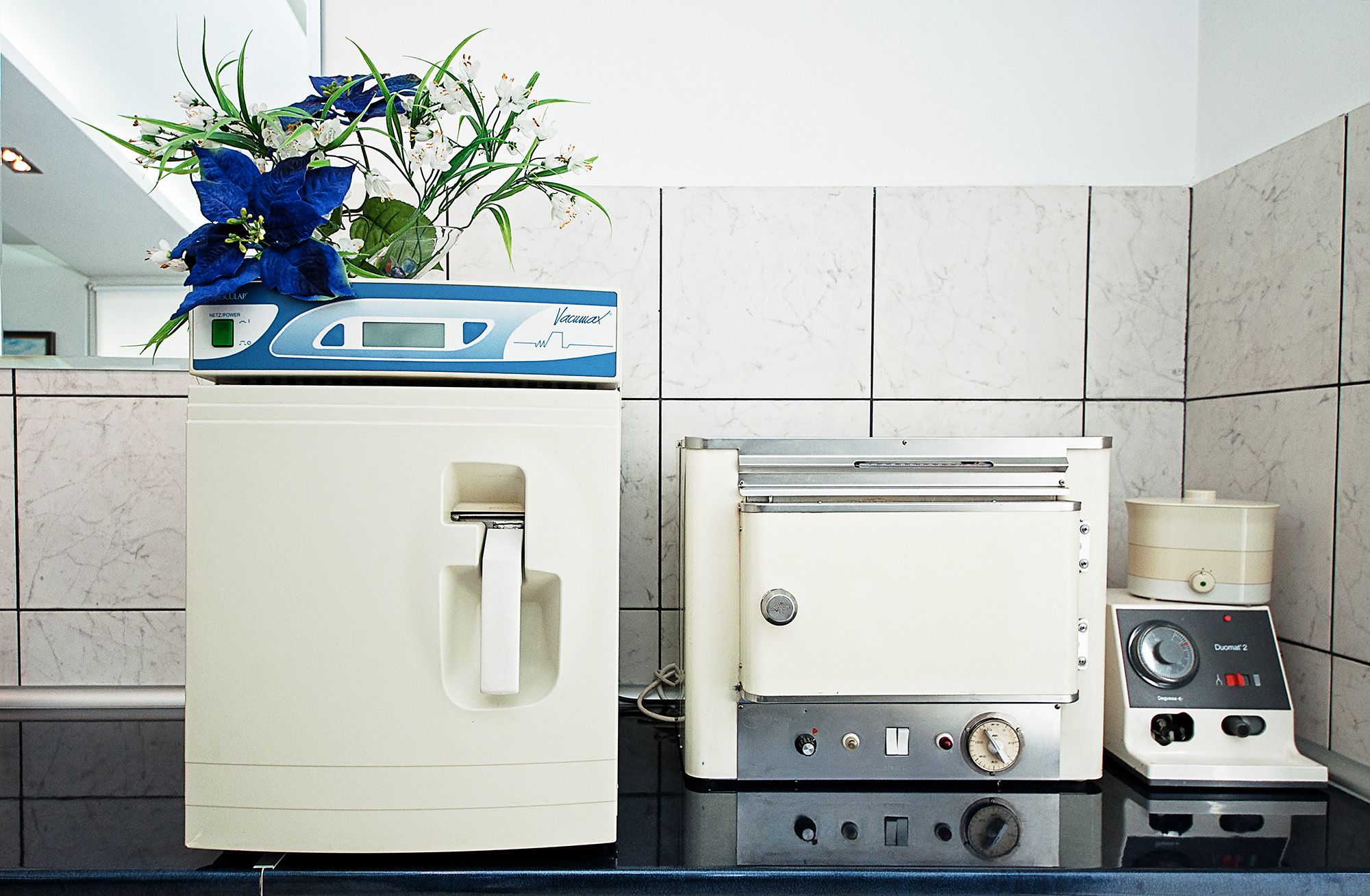 Sterilizacija je jedan od najbitnijih segmenata u funkcionisanju svake stomatološke ordinacije. Apsolutno je neophodno da svi instrumenti i materijali koji se koriste u svakodnevnom radu sa pacijentima budu sterilni. To se sa jedne strane postiže pravilnom sterilizacijom, a sa druge korišćenjem instrumenata i materijala za jednokratnu upotrebu. U našoj ordinaciji na raspolaganju nam je sva neophodna aparatura za kvalitetno čišćenje i sterilisanje instrumenata – kadica sa dezifincijensom, ultrazvučna kadica, suvi sterilizator i autoklav. Tu su i obavezni indikatori i trake kojima se proverava uspešnost sterilizacije. Uz to koristimo različite materijale za jednokratnu upotrebu – čaše, sisaljke, špriceve, igle, rukavice i maske.